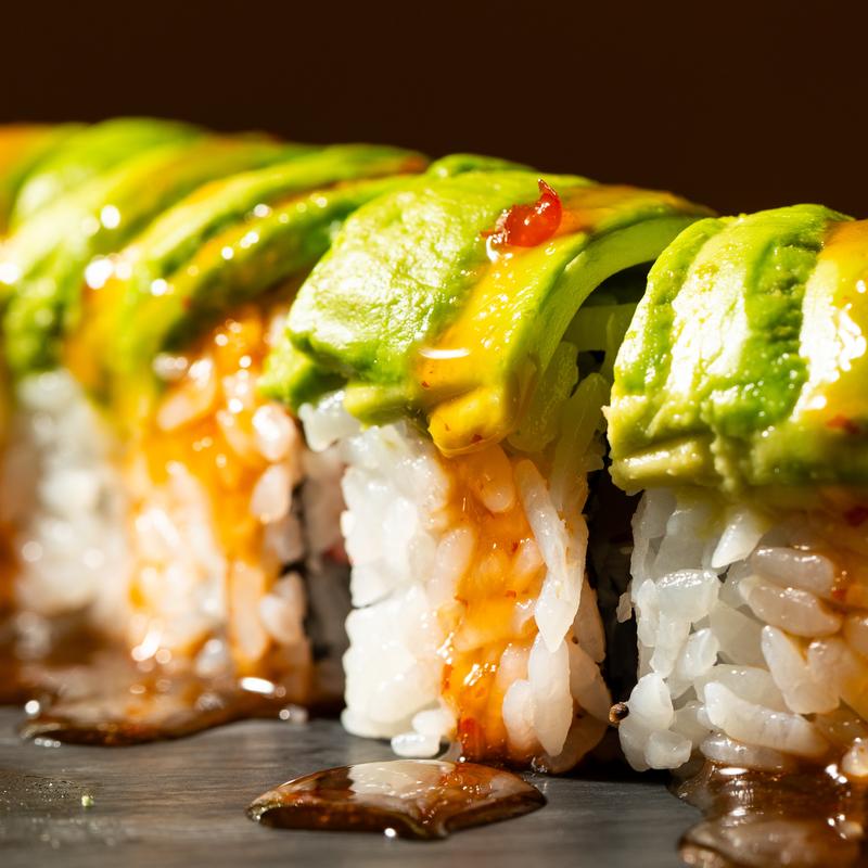 Shrimp tempura & avocado topped with eel sauce and spicy mayo